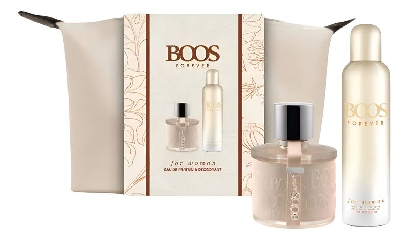 El set Boos Forever es una fragancia femenina elegante y envolvente que combina un Eau de Parfum de 100 ml con un desodorante corporal de 127 ml. Está diseñado para ofrecer una fragancia duradera, con notas frutales iniciales, delicada flor de durazno en el corazón, y un fondo cálido y amaderado que aporta profundidad y sensualidad. Perfecto como set de regalo o para quienes quieren una rutina sensorial completa.