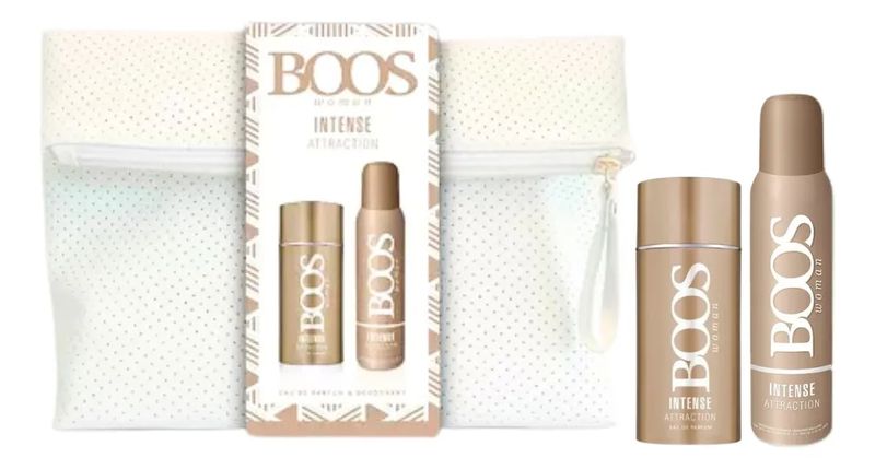 Boos Intense Attraction Woman es un set pensado para mujeres que irradian confianza y elegancia. Su fragancia floral-oriental combina dulzura y sensualidad en perfecta armonía. Incluye un Eau de Parfum y un desodorante corporal con la misma esencia, presentados en un práctico neceser de regalo, ideal para llevar a todos lados o sorprender a alguien especial.