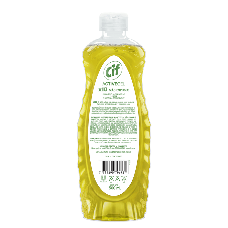 Descubrí la revolución en el lavado de platos con el nuevo Cif Active Gel Limón, el detergente diseñado para quienes buscan máxima eficacia. Su exclusiva Tecnología Active Gel genera 10 veces más espuma, una espuma de máxima consistencia y duración, garantizando un desengrase efectivo y una experiencia de lavado de platos superior. Su fórmula con activos 100% anti grasa aseguran un máximo desengrase dejando tu vajilla impecable. Este es el mejor detergente del mercado, con mayor nivel de activos anti grasa, diseñado para darte un desengrase imbatible y un brillo extraordinario. Olvidate de la grasa y viví una nueva experiencia con un detergente concentrado que mejora todos tus lavados.