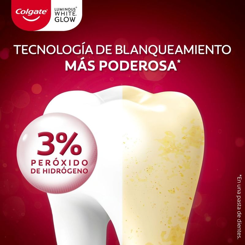 Colgate Luminous White Glow es ideal para blanquear los dientes en casa y eliminar más de 10 años de manchas*. Su fórmula contiene peróxido de hidrógeno al 3%, el mismo ingrediente que utilizan los dentistas para blanquear los dientes.
