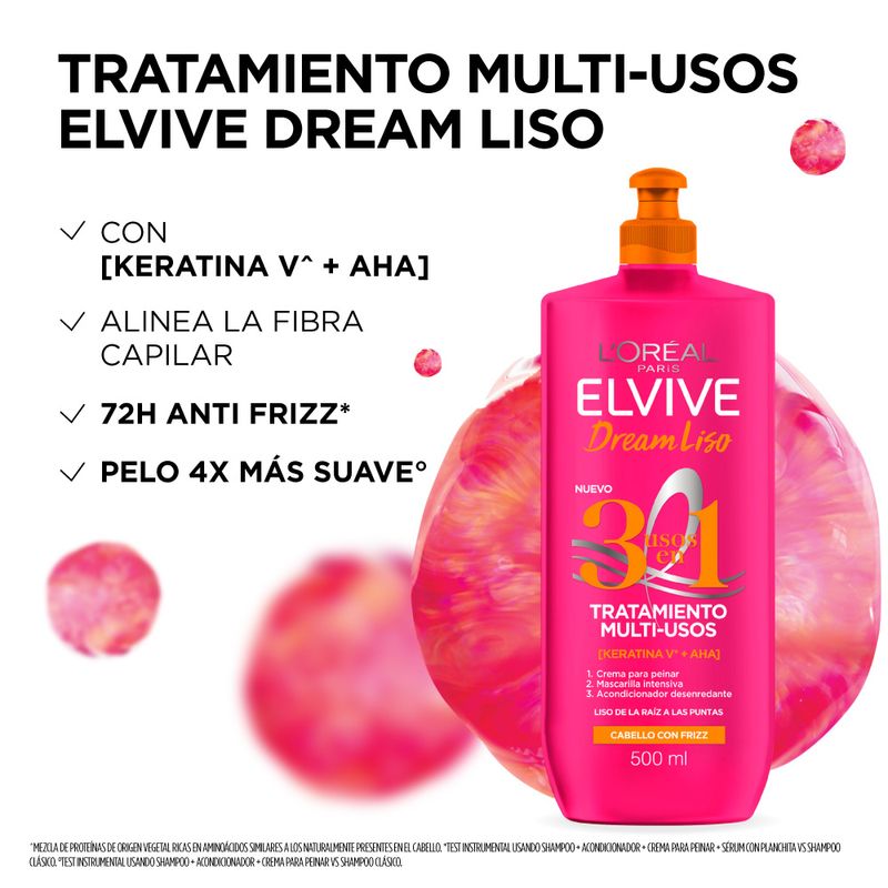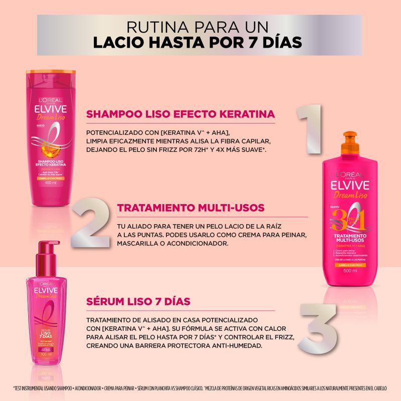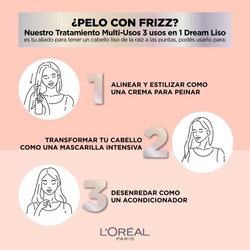 ¿Pelo con frizz? Nuestro Tratamiento Multi-Usos 3 usos en 1 Dream Liso es tu aliado para tener un pelo lacio hasta las puntas. Podes usarlo para: