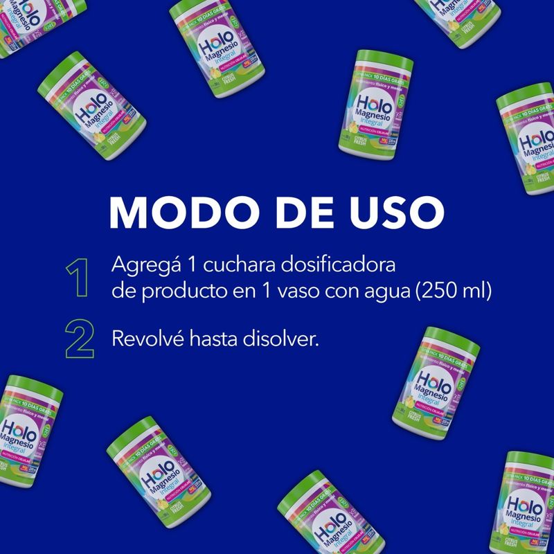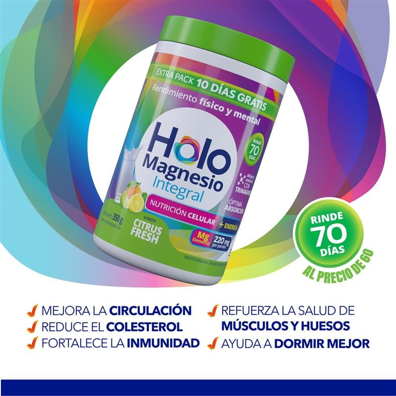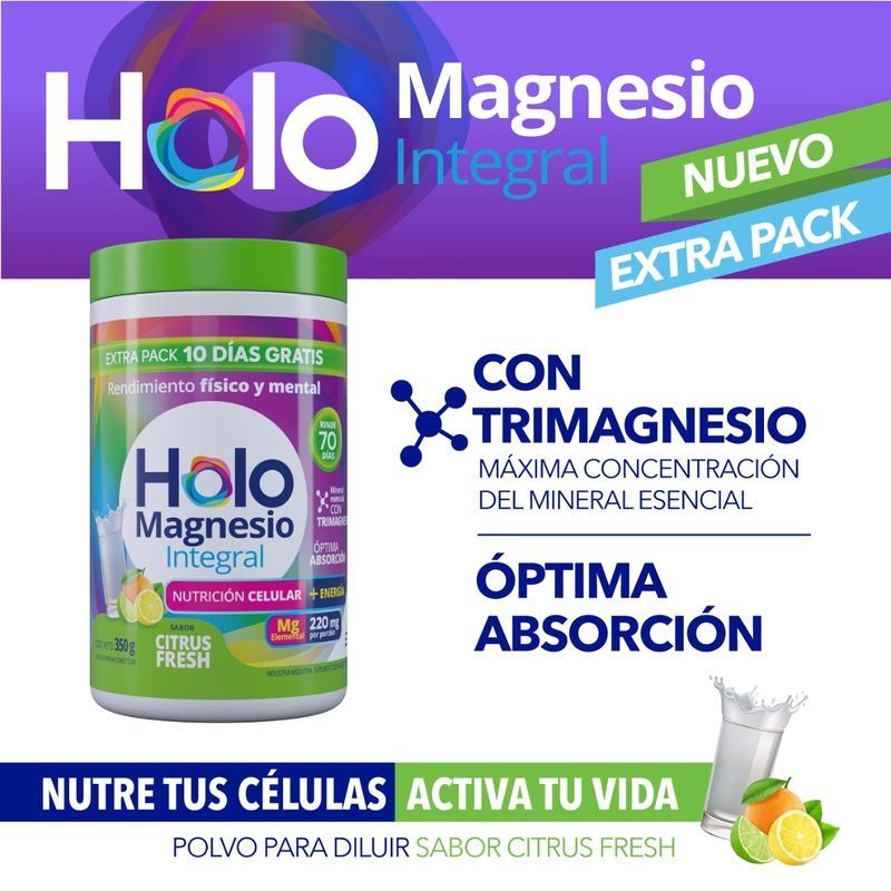 Holomagnesio Integral Extra Pack (sabor Citrus Fresh) es un suplemento dietario con Trimagnesio de Óptima Absorción que colabora con múltiples funciones del cuerpo: fortalece la salud de huesos y músculos, mejora el descanso, regula la circulación, equilibra los niveles de colesterol, fortalece la inmunidad, entre otros. Concentra gran cantidad por dosis: 220 mg de citrato de magnesio por porción.