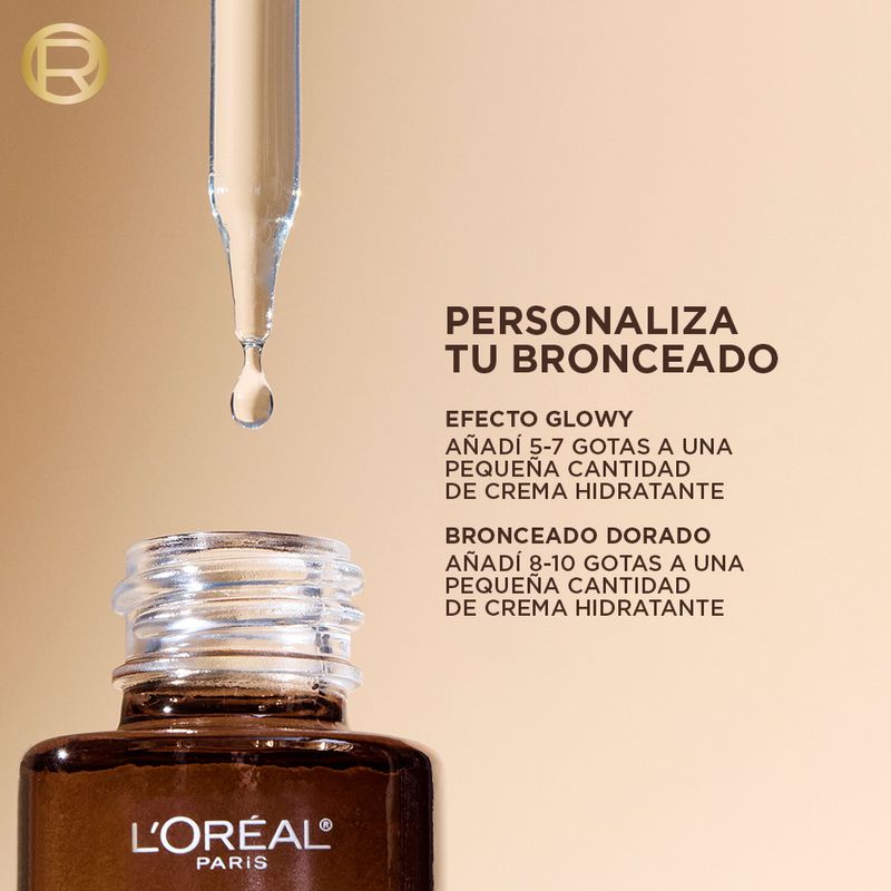 Elige la profundidad de tu bronceado: Para un bronceado más claro, añadir de 5 a 7 gotas a una pequeña cantidad de hidratante. Para un bronceado resplandeciente más intenso, añadir de 8 a 10 gotas. Añade más gotas para intensificar el bronceado. Volver a aplicar a diario hasta que te encante tu bronceado resplandeciente y tu piel suave.