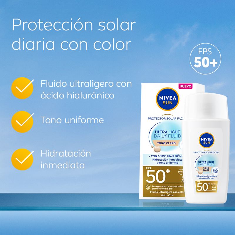 El protector solar facial NIVEA SUN Ultra Light Daily Fluid Tono Claro protege la piel saludable desde el exterior frente a los rayos UVA/UVB y frente a los efectos de la luz visible de alta energía, como el envejecimiento prematuro de la piel. Su fórmula combina 2 ingredientes claves: Ácido Hialurónico, hidrata inmediatamente y brinda una sensación de piel fresca; y Licochalcona A, un potente antioxidante natural que activa el mecanismo de defensa propio de la piel. El fluido ultra ligero con pigmentos de color y cobertura de larga duración, cubre efectivamente las imperfecciones del rostro, dejando una textura uniforme y natural en la piel. Proporciona un efecto matificante y no deja sensación grasosa ni pegajosa. Ideal para su uso en capas y re-aplicación sin efecto borrador. Rápida absorción y resistente al sudor. Contiene FPS 50+ y es adecuado para todo tipo de pieles, incluso pieles sensibles.